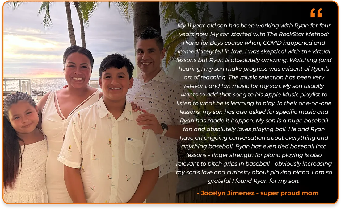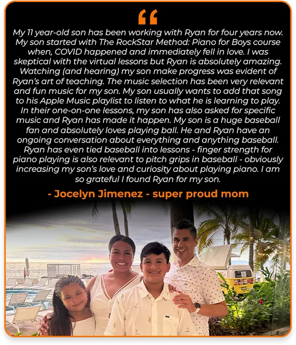 Shhh, don’t tell anyone we taught you these… In addition to mastering full songs taught in The RockStar Method: Piano for Boys course, each month you’ll get a bonus lesson teaching your son an advanced, SuperSecret Epic Piano Riff by ear! Challenging his skills on piano, and his ability to mimic what he sees and hears on the piano! [$250 VALUE]